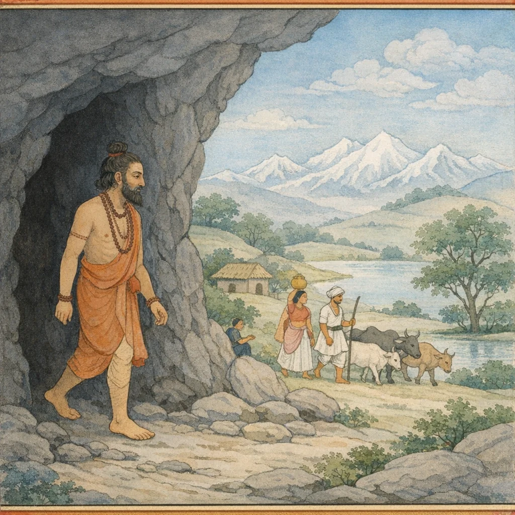 Thus instructed, the king bowed down to the Lord of the worlds, Acyuta. Then, emerging from the mouth of the cave, he beheld only a few men.