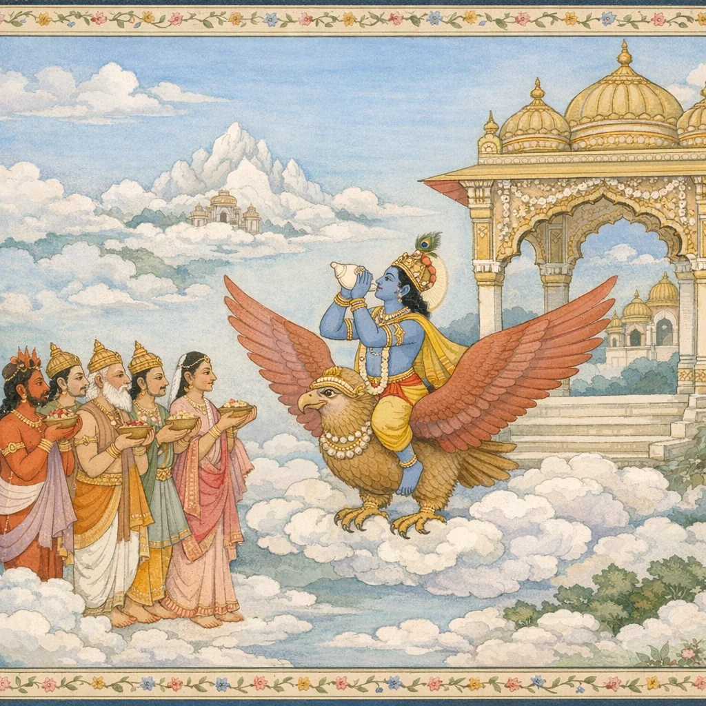 Parashara tells Maitreya: Garuda, bearing Varuna’s parasol and the Mani mountain, carries Hrisikesha with Satyabhama to the gate of heaven; the Lord summons the devas with a conch-blast. Entering the abode of Aditi, Mother of the gods, He beholds her, returns Aditi’s earrings to Shakra (Indra), and reports Naraka’s slaying. Aditi offers praise; in that context the nature of maya, transcendence of the three gunas, the Lord’s all-Selfhood, and the purpose of hymn are explained, and Maitreya asks, “Why praise the Perfect?” Aditi then grants Satyabhama a boon—freedom from age and disfigurement. After viewing the divine garden, Satyabhama, seeing the Parijata tree, asks to take it to Dvaraka out of co-wife rivalry; the forest-guards and Saci (Indrani) oppose. After messages and counter-messages, Indra comes to battle with the hosts of gods; Krishna sounds the conch and showers arrows, playfully cuts down divine weapons, and Garuda rends the devas. At last the tension of vajra and chakra arises; Hari seizes the vajra, restrains Indra without releasing the chakra, and pacifies the gods—showing that even war is the Lord’s lila, ordered for the establishment of dharma in the world.