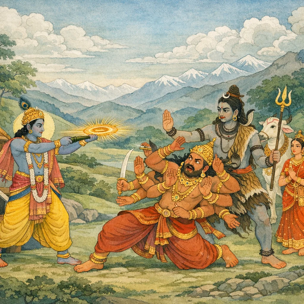 There a dreadful and mighty battle arose between Hari and Śaṅkara; and the discus-bearing Lord hewed away a thousand of Bāṇa’s arms.