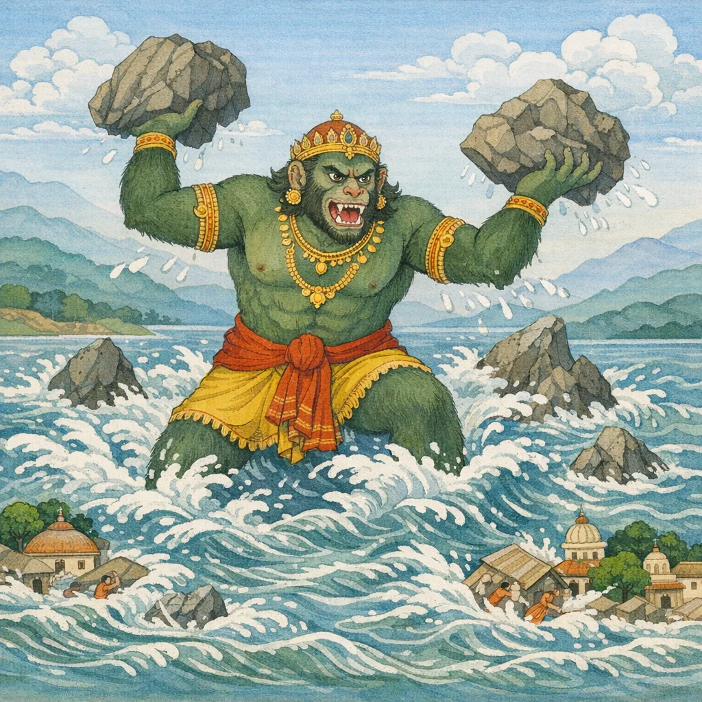 Stirred by that force, O twice-born one, the ocean rose in a wild surge; swift beyond measure, it flooded the shorelands, drowning the coastal villages and even inundating towns and cities.