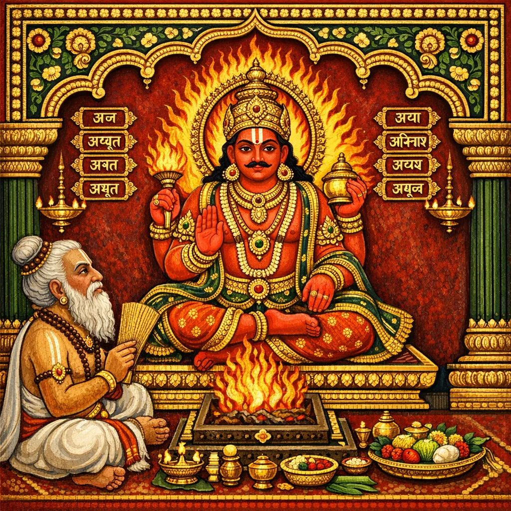 En este capítulo del estrato Kosha, el Señor Agni expone al sabio Vasiṣṭha un mapa semántico conciso de los indeclinables sánscritos (avyaya), tratados como un léxico funcional para el discurso, el habla ritual y la precisión gramatical. Comienza con la partícula ā—sus sentidos (parcialidad, permeación, límite, derivación por dhātu‑yoga) y su comportamiento pragṛhya—y luego ofrece un inventario clasificado de partículas que expresan censura (ku, dhig), coordinación y adición (ca), bendición (svasti), exceso o transgresión (ati), interrogación y duda (svit, nu, nanu), contraste y determinación (tu, hi, eva, vai). Además sistematiza marcadores de tiempo y secuencia (adya, hyas, śvaḥ, tadā, idānīm, sāmpratam), términos espaciales y direccionales (purastāt, pratīcyām, agrataḥ), repetición y frecuencia (muhuḥ, asakṛt, abhīkṣṇam) e interjecciones afectivas (hanta, hā, aho). Incluye exclamaciones rituales (svāhā, vauṣaṭ, vaṣaṭ, svadhā), mostrando cómo las partículas lingüísticas sirven al dharma mediante un uso litúrgico correcto. En conjunto, el capítulo ejemplifica el método enciclopédico del Agni Purāṇa: la ciencia del lenguaje como instrucción sagrada que sostiene la claridad mundana (bhukti) y la recta palabra disciplinada conforme al dharma, en apoyo de la mukti.