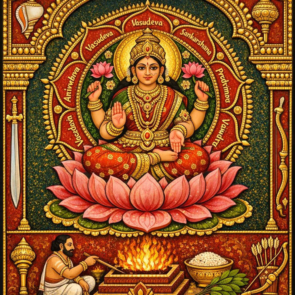 Śrī (Lakṣmī) in the lotus pericarp, with a mandala-like structure: four gates, attendant Śrī-dūtīs at doorways, and an eight-petalled lotus assigned to the four Vyūhas—Vāsudeva, Saṅkarṣaṇa, Pradyumna, and Aniruddha.
