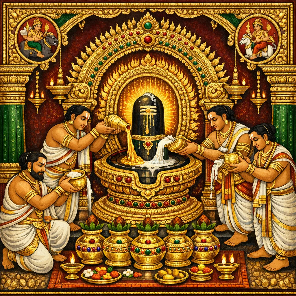 Debe realizarse el baño purificador (para eliminar la impureza) con el Astra-mantra que termina en “hūṃ phaṭ”; y, conforme al rito prescrito, debe bañarse también con pañcagavya y con pañcāmṛta.