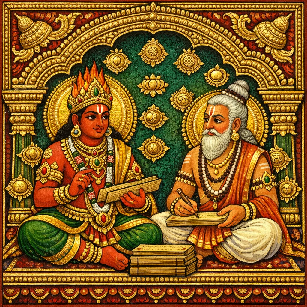 Continuando el currículo de Vyākaraṇa, el texto pasa de tiṅ-siddharūpa (terminaciones verbales finitas) a kṛt-siddharūpa (derivados nominales primarios). Kumāra expone cómo los sufijos kṛt generan sustantivos y participios en los tres dominios semánticos centrales de la derivación sánscrita: bhāva (acción/estado), karman (objeto) y kartṛ (agente). El capítulo cataloga sufijos clave y su fuerza de significado: lyuṭ/ktin/ghaÑ para nombres abstractos de acción; participios del tipo kta, principalmente orientados al agente aunque a veces a la acción o al objeto; y formaciones participiales/agentivas como śatṛ/śānac, vuṇ/tṛc. También registra formas especiales y de sesgo védico: derivados con kvip (p. ej., svayambhū), patrones participiales del perfecto liṭ (kvan-su/kān) y derivaciones uṇādi que aparecen “abundantemente en chandas” (uso védico). El hilo pedagógico es taxonómico: sufijo → sentido → ejemplo, subrayando que la ciencia gramatical es una herramienta revelada para la comprensión correcta y la comunicación conforme al dharma.