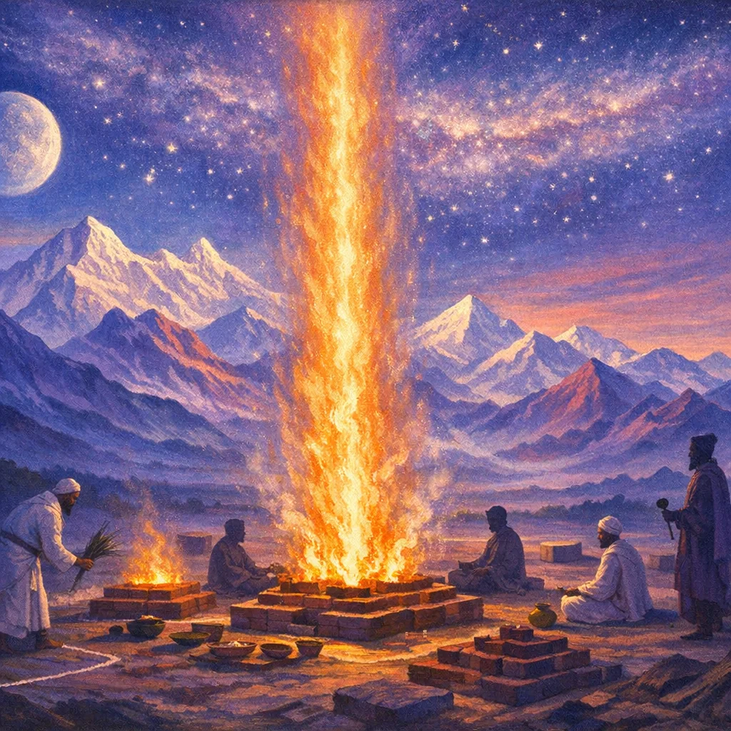 Darśa–Pūrṇamāsa (New- and Full-Moon sacrifices) within the Śrauta Agnihotra/Ādhāna continuum: preparatory and executory acts around the three sacred fires (gārhapatya–āhavanīya–dakṣiṇāgni), including standard yajamāna–patnī participation, iṣṭi-style offerings, and the establishment/maintenance of Agni as the ritual center.