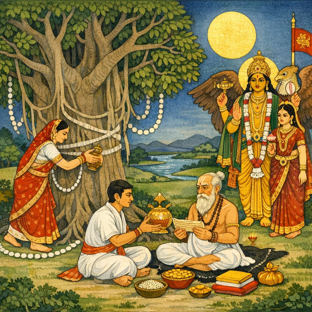 It is explicitly oriented to saubhāgya—unbroken marital auspiciousness—expressed through fasting, banyan worship, 108 circumambulations, and a prayer to Sāvitrī for never being separated from one’s husband, followed by feeding married women.