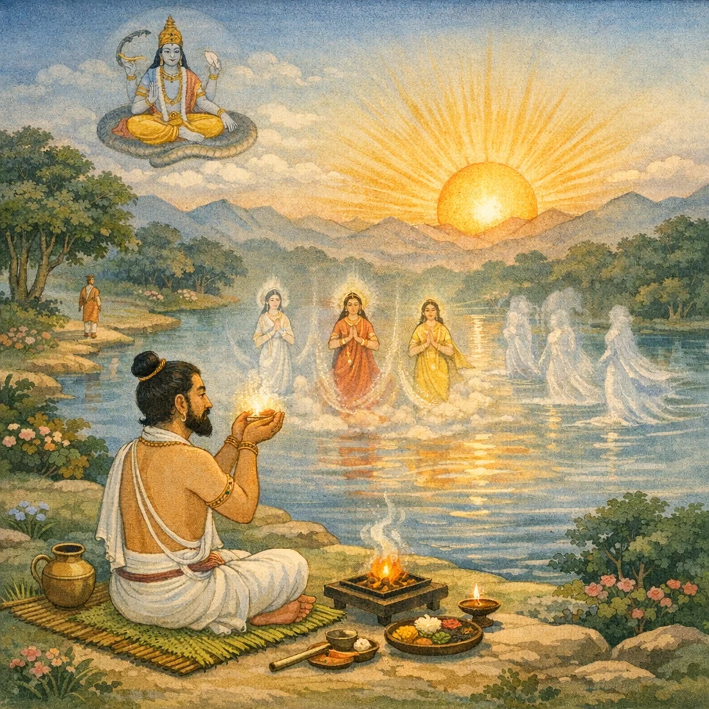 Tras lavar la ribera y colocar allí hierba darbha, entrese en el agua. Habiendo hecho reverencia, invoque entonces los sagrados tīrthas en ese lugar, llamándolos desde el orbe del Sol.