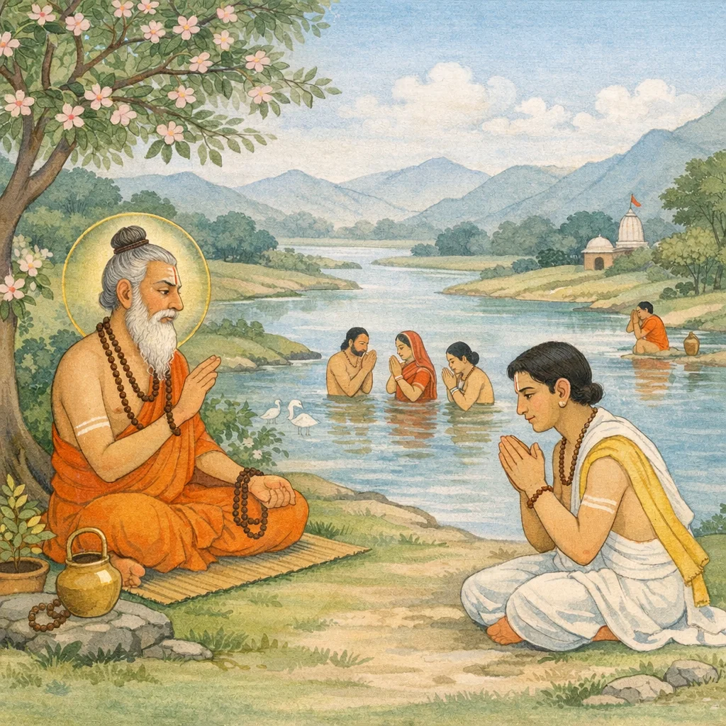 «Oh rey, Agastya, junto con los sabios, está de pie en tu puerta.» Al oír que los munis habían llegado, Rāma salió a recibir a aquellos ascetas, radiantes como el sol.