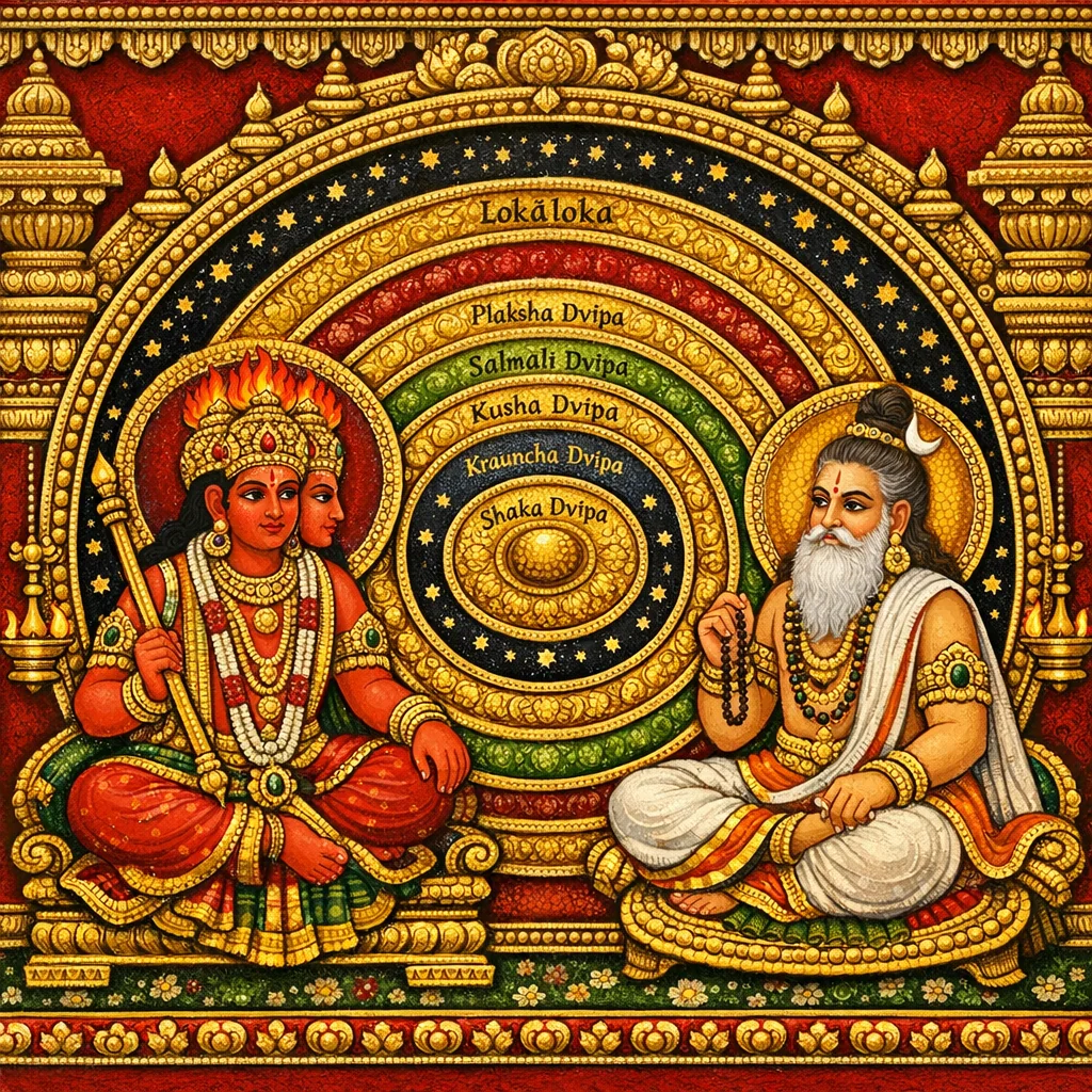 Agni passe de l’unité précédente sur Bhāratavarṣa à une enquête cosmographique ordonnée (mahādvīpādi), élargissant l’horizon du monde humain au modèle des sept continents (sapta-dvīpa). Il commence par Jambūdvīpa—d’une étendue d’un lakh de yojanas et divisé en neuf parts—ceint par l’océan de lait (Kṣīra). Le discours progresse ensuite vers l’extérieur en anneaux concentriques : Plakṣa-dvīpa (avec des souverains issus de Medhātithi, des varṣa nommés, des fleuves principaux et un dharma structuré selon le varṇāśrama), puis Śālmala et les dvīpas suivants ; chacun est caractérisé par un océan distinct : salé, jus de canne, surā/suroda, ghee, petit-lait/eau de caillé, et eau douce. Agni dresse la logique des noms régionaux (varṣa), les généalogies des seigneurs, les montagnes et rivières associées, ainsi que les formes de culte—Soma, Vāyu, Brahmā, Sūrya et Hari—montrant que la cosmographie devient aussi une théologie de la dévotion locale. Le chapitre culmine avec le principe de frontière : la terre dorée et inerte de Svādūdakā, le mont Lokāloka voilé de ténèbres, et la coque cosmique (aṇḍa-kaṭāha), offrant un modèle purāṇique d’un ordre du monde fini et mesuré, enchâssé dans un cosmos enveloppant.