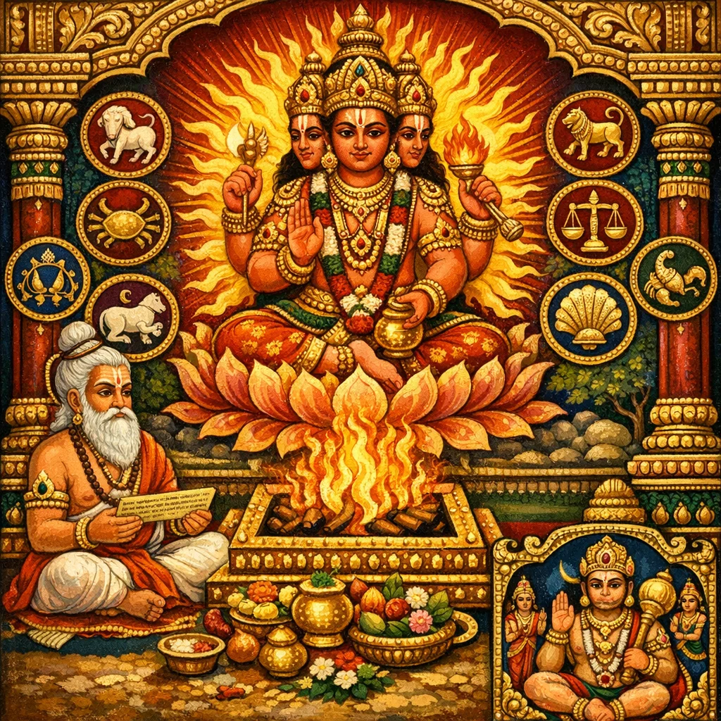 Le Seigneur Agni enseigne à Vasiṣṭha un corpus de savoirs tournés vers la victoire guerrière, unissant mantra-vidyā, physiologie subtile et astrologie du combat. Le chapitre s’ouvre sur le mantra de Karṇamoṭī, formule opérative courroucée pour marana/pātana, mohana et uccāṭana, puis présente Karṇamoṭī comme une « mahāvidyā » fondée sur le svarodaya (flux des voyelles) et le mouvement du prāṇa entre le nābhi et le hṛd. Des consignes tactiques apparaissent par la logique des points vulnérables (percement de l’oreille/de l’œil) et par le ciblage interne (cœur–pāyu–gorge) afin de contrer fièvres, brûlures et forces hostiles. Suit une taxonomie des divinités selon les cakra : des śakti assignées au Vāyu-cakra, à Tejas et au Rasacakra, incluant 32 mātṛkā disposées en octets. Le texte formalise ensuite la puissance phonétique des varga pour la victoire (pañcavarga) et s’étend à la Jyotiṣa : combinaisons tithi–nakṣatra–vāra, aspects (dṛṣṭi), logique des signes « pleins/vides » et règles heuristiques des planètes pour l’issue des batailles. Présages (signes du corps), séquençage directionnel du Rāhu-cakra et conditions de victoire culminent en rites de stambhana, protections par herbes/amulette, opération de feu au terrain de crémation, et paṭa de Hanumān dont la seule vue met l’ennemi en déroute.
