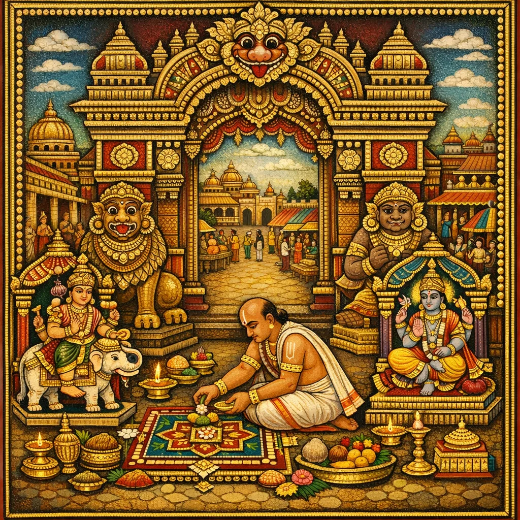 Après avoir dûment adoré Viṣṇu, Hara (Śiva), le Soleil et les autres divinités, puis s’être incliné devant eux, le patron doit offrir le bali (oblations rituelles). Dans le secteur Agneya (sud-est) de la cité, il doit établir les orfèvres et les artisans du métal.