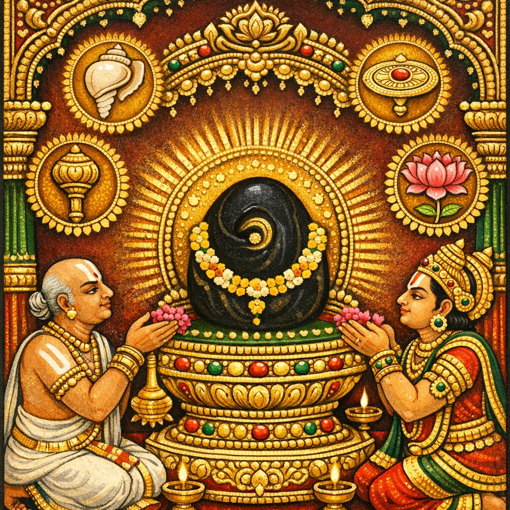 Poursuivant le courant de Vāstu–Pratiṣṭhā et d’Īśāna-kalpa, le Seigneur Agni expose le Pratimā-Lakṣaṇa par une lecture diagnostique du Śālagrāma (pierres sacrées) et des signatures de mūrti apparentées. Le chapitre présente ces formes comme bhukti-mukti-pradā—dispensant le bien-être mondain tout en orientant le fidèle vers la délivrance—inscrivant ainsi la taxinomie iconographique dans une visée sotériologique. Une suite d’identifications divines (Vāsudeva, Saṅkarṣaṇa, Pradyumna, Aniruddha, Nārāyaṇa, Viṣṇu, Narasiṃha, Varāha, Kūrma, Hayagrīva, Vaikuṇṭha, Matsya, Śrīdhara, Vāmana, Trivikrama, Ananta, Sudarśana, Lakṣmī-Nārāyaṇa, Acyuta, Janārdana, Puruṣottama) est corrélée à des marqueurs visibles : nombre de cakra, teinte, lignes (rekhā), points (bindu), perforations (chidra/śuṣira), volutes (āvarta) et formes d’emblèmes telles que la silhouette de la gadā. Le propos est à la fois liturgique et classificatoire : la juste reconnaissance des formes garantit un culte et une consécration corrects, accordant le support matériel sacré à l’intention dharmique.