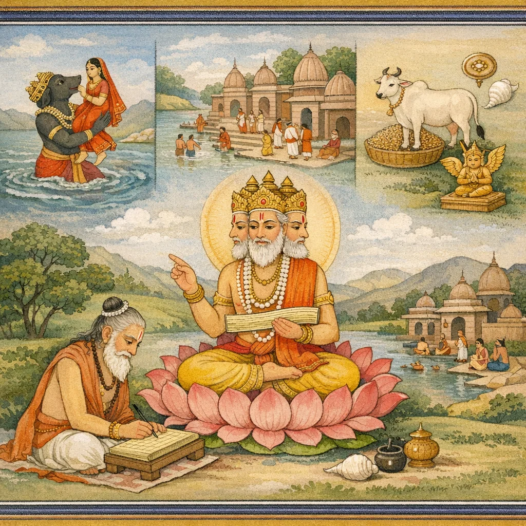 Brahmā donne l’index-résumé (Anukramaṇikā) du Varāha Purāṇa (24 000 vers; deux divisions). Il met en lumière le dialogue d’ouverture entre Bhūmī et Varāha et honore Vyāsa comme incarnation de Nārāyaṇa. Le plan énumère des cycles narratifs (Rambhā, Durjaya, Śveta, l’épisode du fils d’un sage lié à Yama), des sections centrées sur les divinités (manifestation de Gaurī, Vināyaka, Nāgas, Gaṇas, Kubera/Dhanada, Ādityas) et des enseignements rituels : śrāddha-vidhi, observances de parvan, go-dāna, vratas, pèlerinages aux tīrthas, et prāyaścitta pour trente-deux fautes. Sont particulièrement soulignés Mathurā et Gokarṇa, destructeur de péchés ; la division Uttara est présentée comme un dialogue Pulastya–Kuru exposant le tīrtha-māhātmya (dont Puṣkara) et les observances festives. Le chapitre s’achève sur le fruit de l’écoute/de la récitation/de l’écriture : la bhakti envers Viṣṇu s’accroît et l’état vaiṣṇava est promis, avec des dons prescrits (Garuḍa d’or, tila-dhenu) et une aumône du mois de Caitra à un brāhmaṇa.
