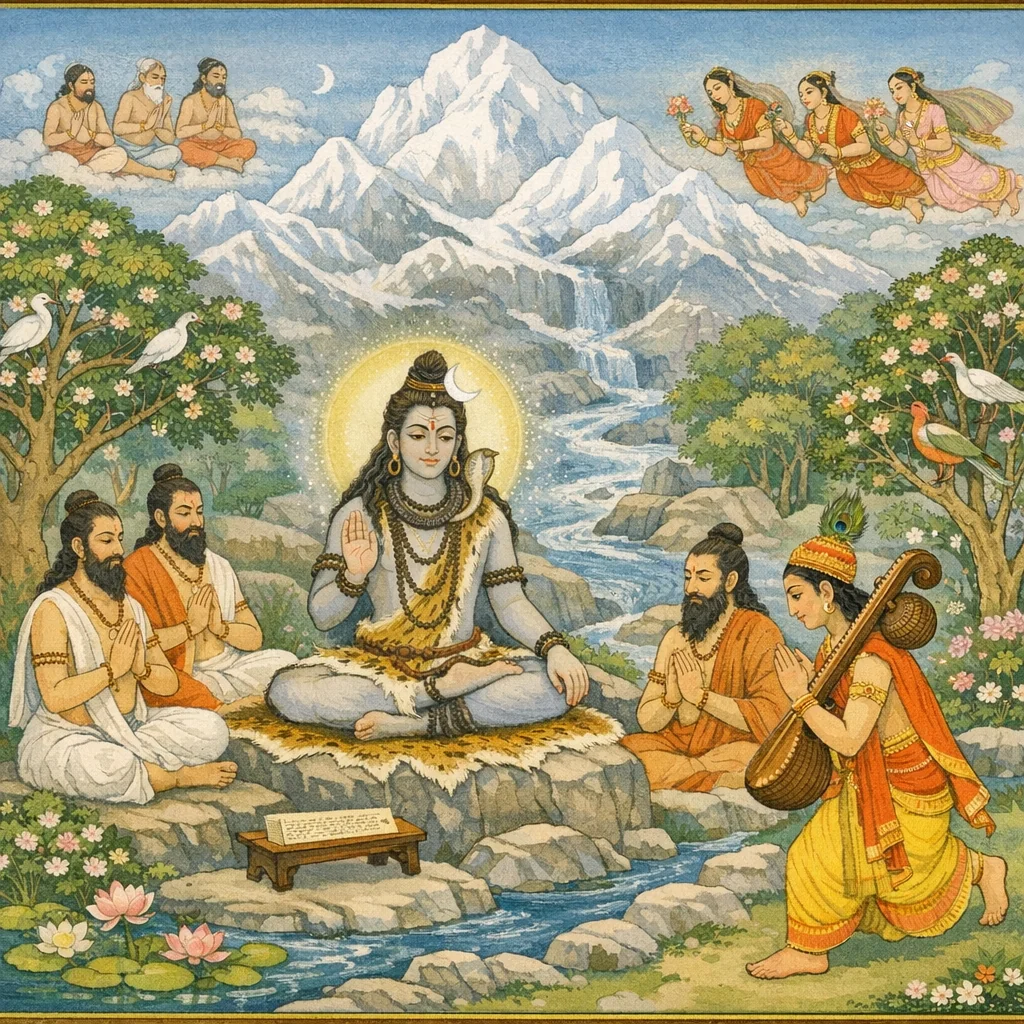 Il s’enquit de la connaissance Śāmbhava, la sagesse libératrice qui délivre l’âme liée des entraves de Paśu et de Pāśa. Le Seigneur Śiva, le cœur satisfait par la bhakti de ce dévot, lui répondit avec respect et sollicitude.