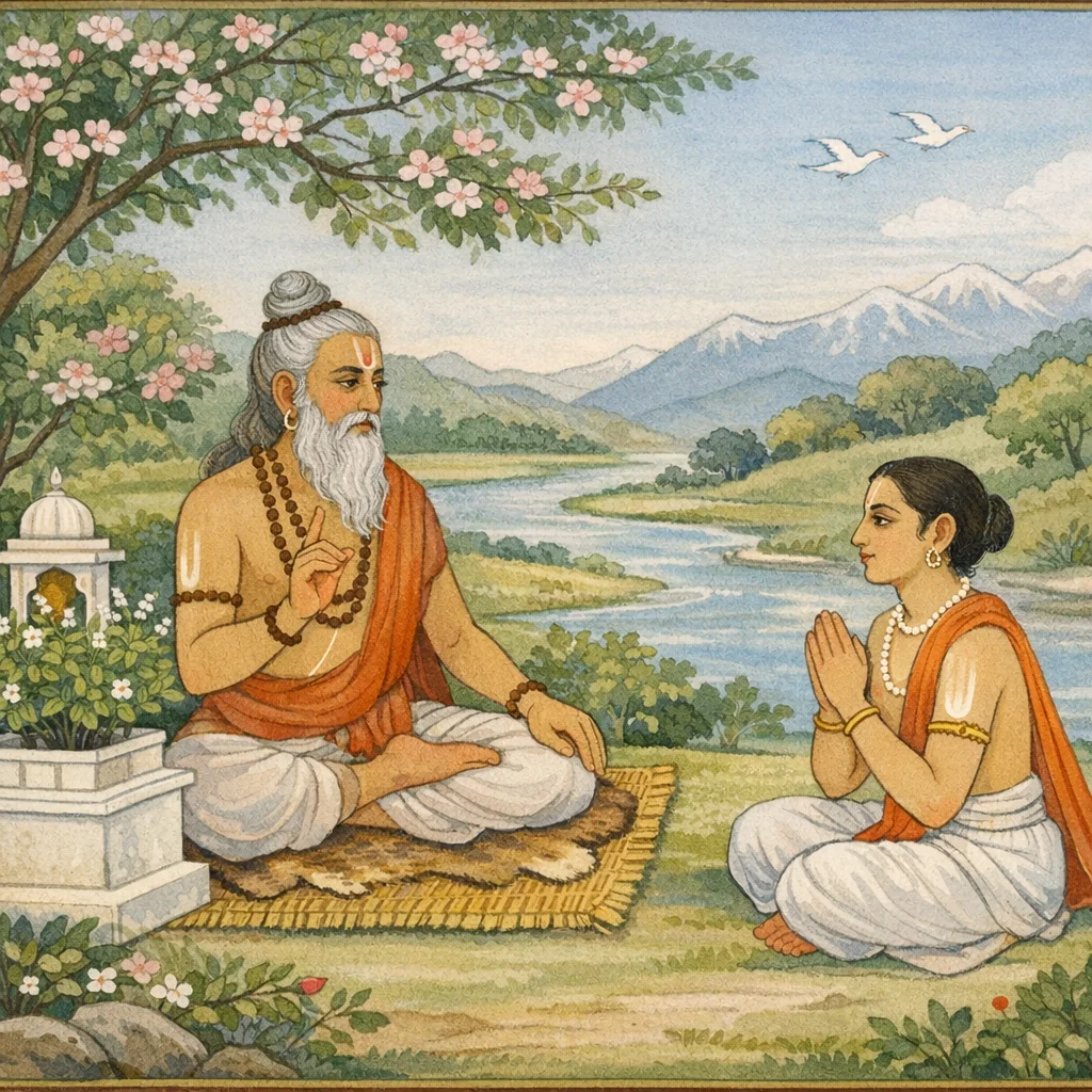 Et Rambhā se prosterna à son tour, manifestant aussi son affection. Après avoir rendu hommage, le prince s’adressa à son propre maître.
