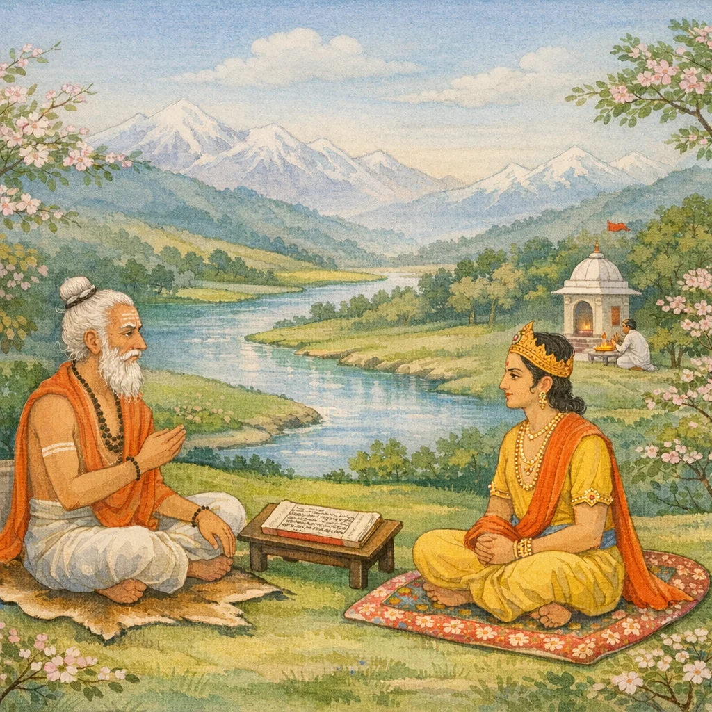«Ô justes, vous interrogez d’une manière très excellente sur tous les principes véritables. Le premier, le plus éminent, est appelé Meru, entouré de devarṣis et de gandharvas.»