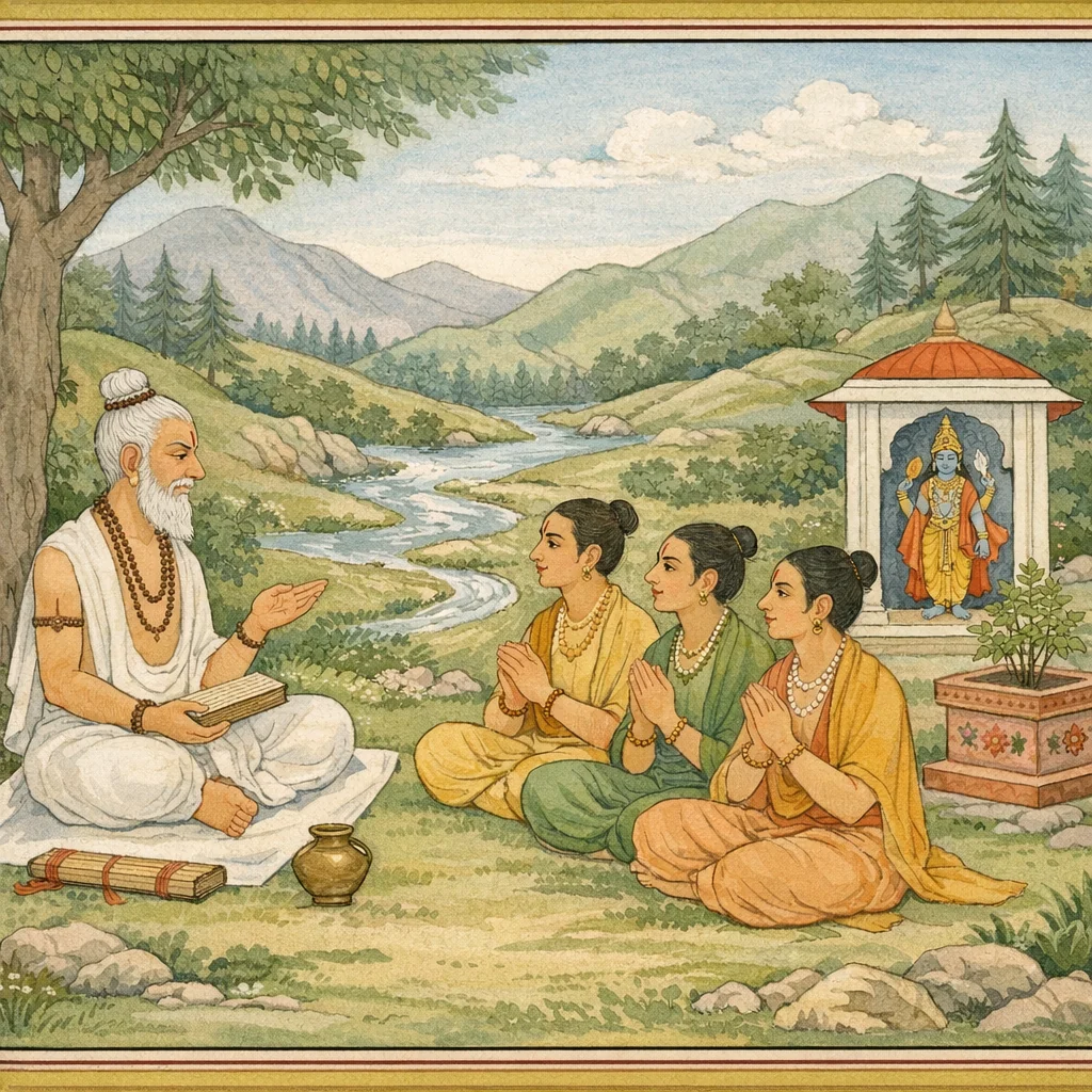 Nārada interroge Mahādeva (Śiva) sur les observances renommées du Cāturmāsya, lorsque Hari est dit demeurer dans le sommeil yogique. Le chapitre fixe la saison rituelle : elle commence à Āṣāḍha śukla Ekādaśī ; Viṣṇu est « mis au repos » quand le Soleil est en Mithuna (Gémeaux) et « s’éveille » quand il est en Tulā (Balance). Il est aussi indiqué que certains rites auspices sont alors ajournés. Sont prescrites des disciplines de dévotion : dormir à même le sol, renoncements alimentaires (y compris aux six saveurs), silence, règles de pureté, et culte intensifié de Viṣṇu—installation, offrandes, tulasī, nāma-japa et écoute des Purāṇa. Un long catalogue de fruits (phala) assimile le mérite du Cāturmāsya à de grands sacrifices (tels mille Aśvamedha) et relie chaque abstinence à une récompense précise : beauté, descendance, mondes célestes et Vaikuṇṭha. Le texte ajoute des avertissements éthiques et sociaux—ahiṃsā, charité, compassion, maîtrise de soi—et met en garde contre la médisance, l’impureté et les fréquentations fautives au Kali-yuga. Il conclut que la simple audition de cette observance confère un mérite sanctifiant.