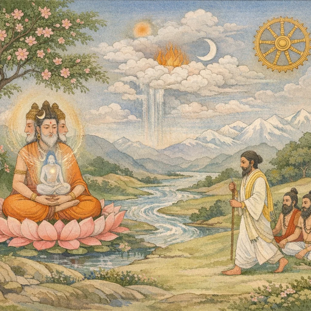 Dans ce chapitre, Brahmā s’adresse à Nārada et expose une suite technique de cosmogonie et d’ordre institutionnel. Il décrit d’abord la formation des éléments grossiers par le pañcīkaraṇa : à partir de l’ensemble subtil commençant par le son (śabda) naissent ākāśa, vāyu, agni, jala et pṛthivī. Il évoque ensuite la production des montagnes, des océans et des arbres, ainsi que l’organisation du temps selon les kalā et les cycles de yuga. Malgré ces actes, Brahmā confesse son insatisfaction jusqu’à ce qu’il médite sur Śiva (Sāmba) ; alors il engendre les « sādhaka » et des ṛṣi majeurs à partir de sources corporelles précises (yeux, cœur, tête et souffles vitaux). Le Dharma naît du saṅkalpa comme instrument universel rendant possible toute sādhana ; sur l’ordre de Brahmā, il prend forme humaine et se propage par les sādhaka. Brahmā crée encore de nombreuses descendances issues de divers membres, leur assignant des incarnations variées, y compris de type deva et asura. Enfin, sous l’impulsion intérieure de Śaṅkara, il divise son propre corps et devient de double forme, marquant le passage d’une puissance indifférenciée à des modalités créatrices différenciées sous la souveraineté de Śiva.