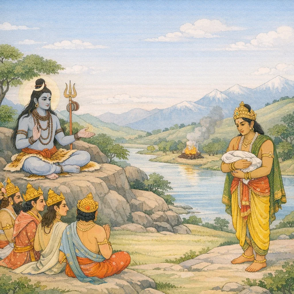 Sanatkumāra dit : Ayant ainsi entendu les paroles des habitants du ciel, Maheśa—dont les actes sont un vaste jeu divin—leur répondit, libre et souverain, tandis qu’ils se tenaient les mains jointes en vénération.