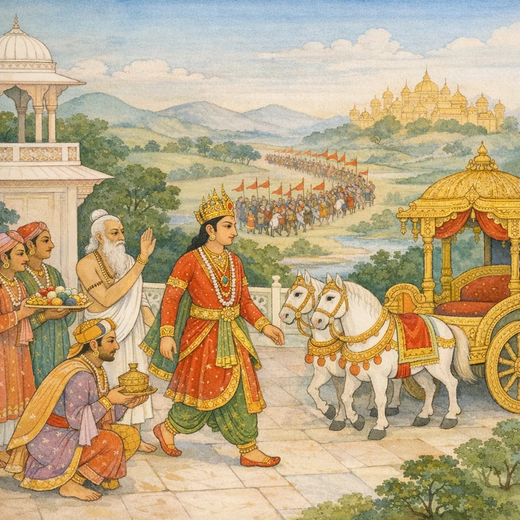It depicts sovereignty as ritually mediated and guru-sanctioned, while implying that power derived from tapas/boons remains karmically conditioned and can precipitate conflict that invites divine rebalancing.