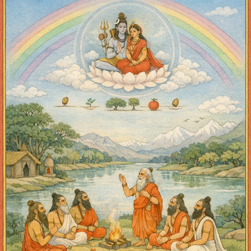 La transformation de Pradhāna (la Nature primordiale) et l’activité de Puruṣa (le principe conscient) : tout cela ne se déploie que sous le gouvernement de Satyavrata, le Seigneur du vœu de vérité (Śiva).