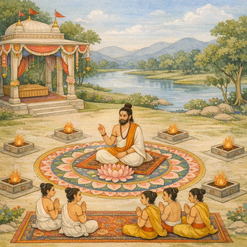 Upamanyu dit : En un jour faste, dans un lieu pur, exempt de nombreux défauts, le précepteur spirituel (deśika) doit d’abord accomplir le rite de consécration nommé « samaya-āhvaya », l’invocation de l’observance sacrée, établissant ainsi le disciple dans la règle et l’orientation justes pour l’adoration de Śiva.