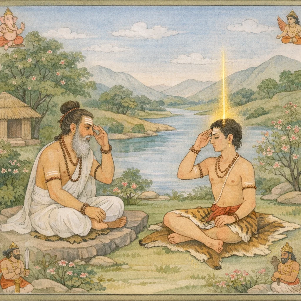 De ces deux—pratique et connaissance—naît la délivrance; qu’on se consacre donc à la méditation. L’esprit transpercé par la foi (śraddhā), qu’on fixe la contemplation au dvādaśānta (l’extrémité des douze), ou sur la couronne de la tête, sur le front, entre les sourcils, au bout du nez, ou dans la bouche, à la gorge, dans le cœur, ou au nombril — au séjour éternel.