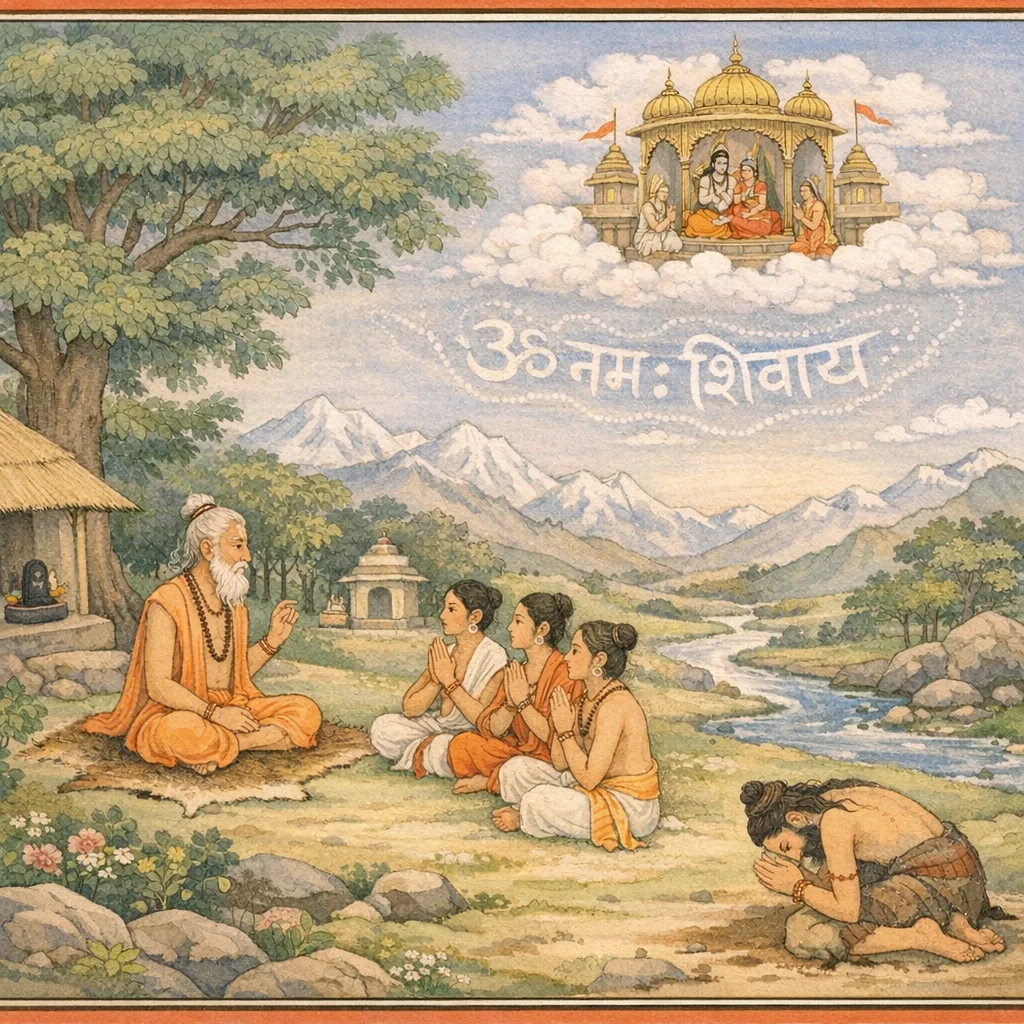 Quiconque, avec dévotion, adore Śiva ne fût-ce qu’une seule fois au moyen du mantra aux cinq syllabes, atteint lui aussi la demeure de Śiva, par la majesté et la puissance sanctifiante du mantra de Śiva.