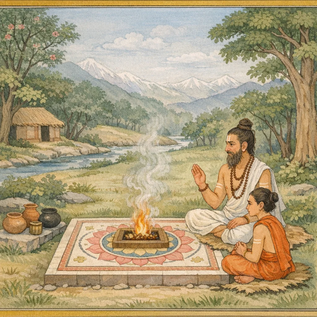 Upamanyu dit : «À présent je décrirai le rite lié au feu sacré—qu’il soit accompli dans un kuṇḍa (fosse à feu) ou même sur un autel de terre préparé ; ou sur une vedī, ou dans un récipient de fer, ou dans un pot de terre neuf et de bon augure.»