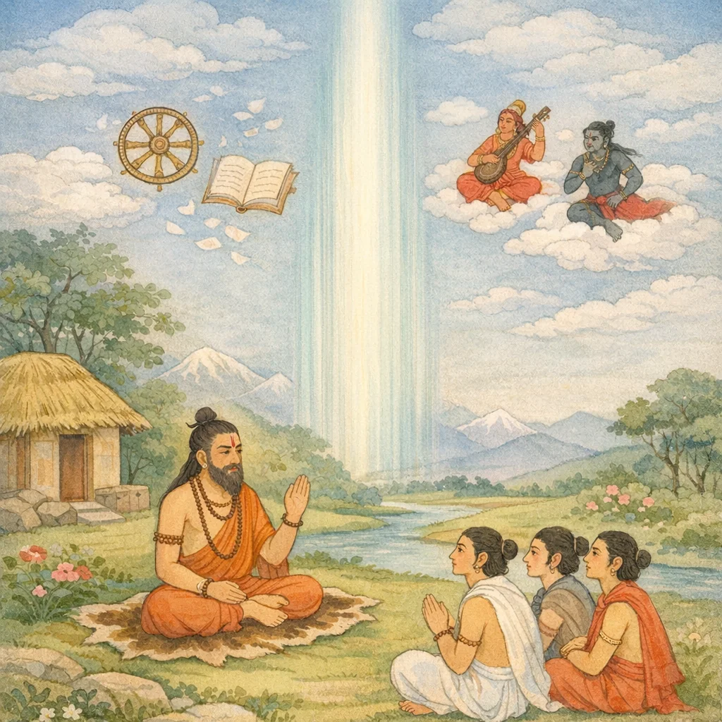 Tout ceci—l’univers entier dans sa triple division—est exprimé par les trois mātrās (de Oṃ). Mais par la demi-mātrā, on est éveillé à la réalisation que Śiva est le Soi même : le Seigneur transcendant au-delà de la triade, dispensateur de la connaissance libératrice.