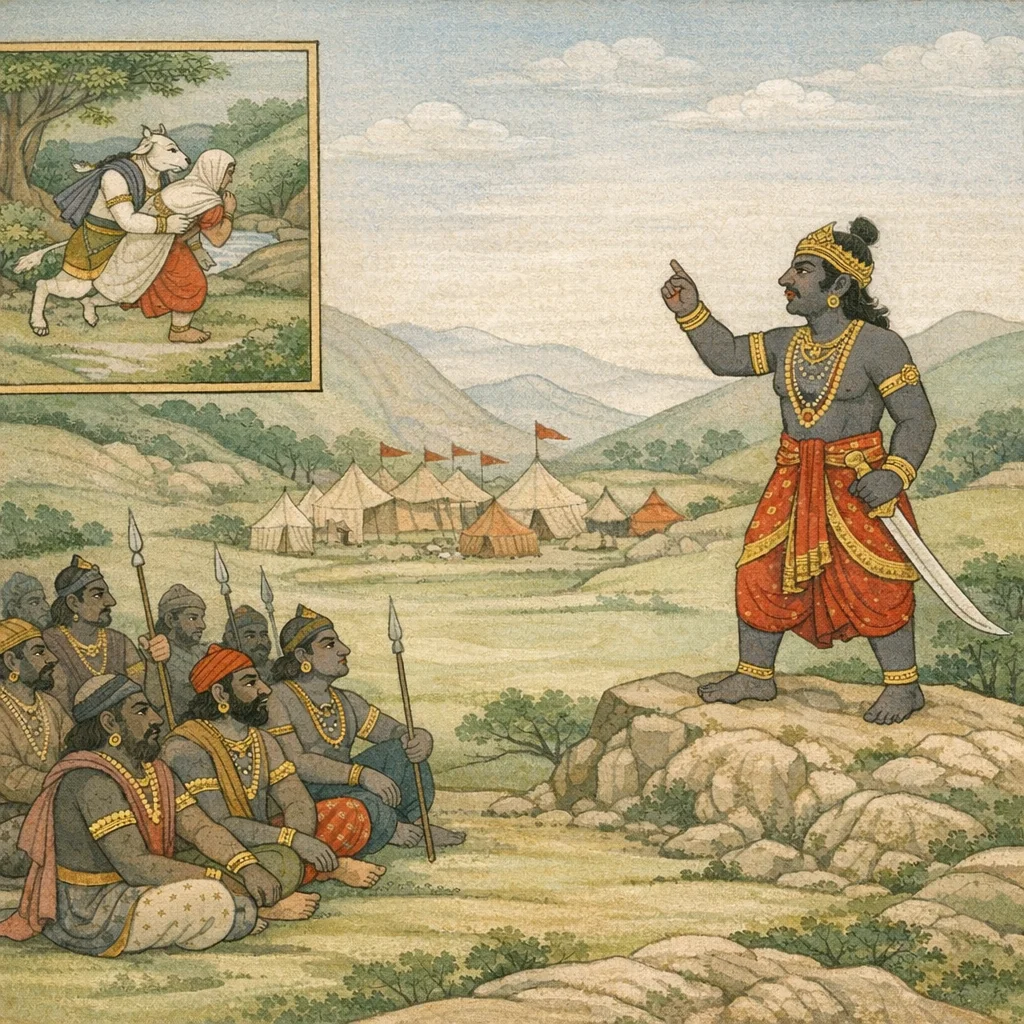 Śiva as Girijeśvara exercising sovereign control; Nandin as Śiva’s operative agent; Andhaka as the daitya leader articulating the crisis of lost tejas, sattva, and parākrama.