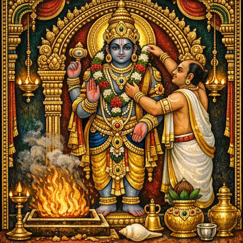 उसी प्रकार पवित्र-तंतु (पवित्र धागे) और पूजा-भाव को हृदय में धारण करो; नियम-पूजन में जो कुछ भी जान-बूझकर या अनजाने में किया गया हो, वह अंतःपूजा के रूप में स्वीकार हो।