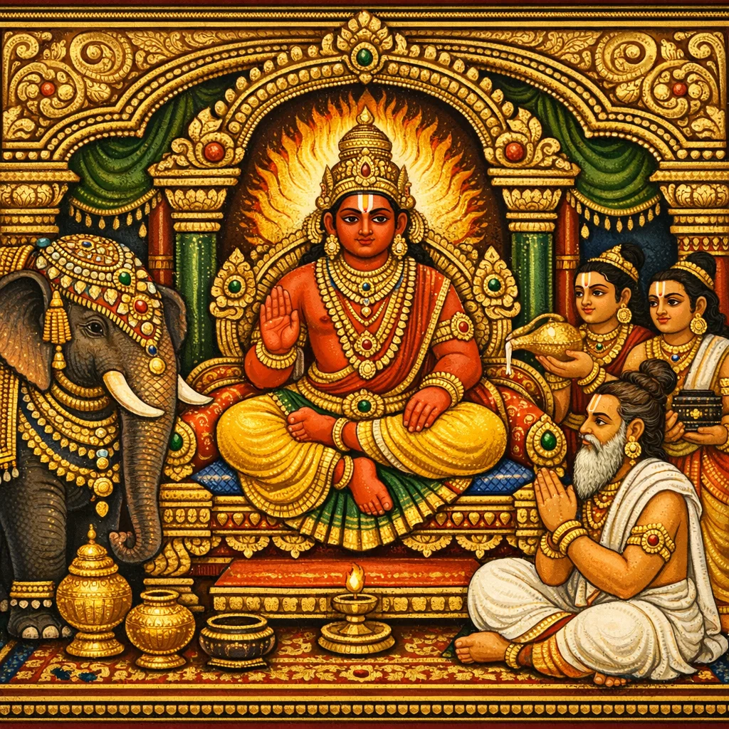 इस अध्याय में पूर्व अध्याय से विधिवत् संक्रमण कर गज-चिकित्सा को आयुर्वेद की विशेष शाखा बताया गया है, जो राजशाला और रण-विजय के लिए अनिवार्य है। पालकाप्य ऋषि लोमपाद से कहते हैं कि सेवा-योग्य शुभ गज-लक्षण—नखों की संख्या, मद-काल का ऋतु-संबंध, दाँतों की असमानता, स्वर की गुणवत्ता, कानों की चौड़ाई, त्वचा पर चित्तियाँ—देखे जाएँ; बौने या विकृत गज त्याज्य हैं। आगे गज-पालन को राजधर्म और सैन्य विजय से जोड़ा गया है—अनुशासित युद्ध-हाथी और सुव्यवस्थित शिविर-नियम ही विजय का आधार हैं। फिर उपचार-क्रम आता है: निर्वात, स्नेहन-योग्य स्थान की तैयारी; बाह्य कर्म—कंधे के उपचार, मालिश; आभ्यंतर औषध—घृत/तैल-योग, काढ़े, दूध, मांस-रस; तथा विशिष्ट रोगों में उपाय—पाण्डु-सदृश पीतता, आनाह, मूर्च्छा, सिरदर्द (नस्य सहित), पाद-रोग, कंपकंपी, अतिसार, कान की सूजन, कंठ-अवरोध, मूत्र-रोध, त्वचा-रोग, कृमि, क्षय-सदृश रोग, शूल, फोड़े का उपचार (चीरा से स्नेहन-बस्ति तक)। अंत में आहार-विहार—धान्य-क्रम, बलवर्धक आहार, ऋतु अनुसार जल-छिड़काव—और युद्ध-धार्मिक पक्ष—विजयार्थ धूपन, नेत्र-प्रक्षालन/अंजन, मंत्र-संबद्ध नेत्र-बल—से अग्नि-पुराण की चिकित्सा, युद्ध-विज्ञान और पवित्र प्रभाव की संयुक्त परंपरा प्रकट होती है।