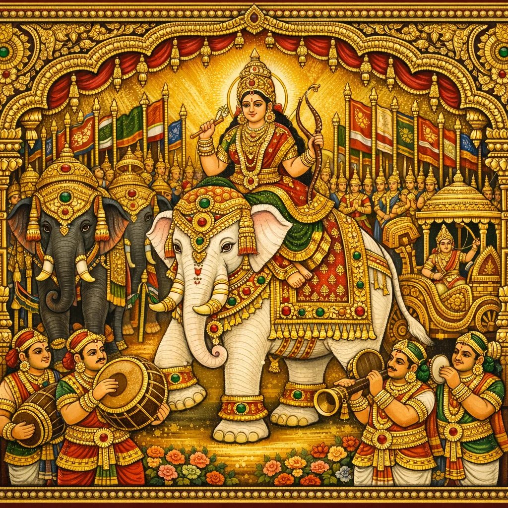 फिर ऊँचे ध्वजों की पंक्तियाँ चलीं—कहीं महिष-चिह्न, कहीं मृग-चिह्न, और कहीं सिंह-चिह्न धारण किए हुए शक्तियाँ नगर में आगे बढ़ीं।