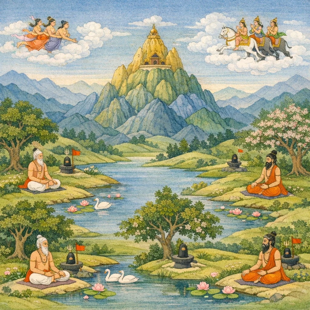 It repeatedly frames mountains, forests, and lakes as Rudra-kshetras—spaces sanctified by Shiva’s presence—thereby turning cosmography into a devotional and contemplative support for Shiva-smriti and Linga-oriented sacred orientation.