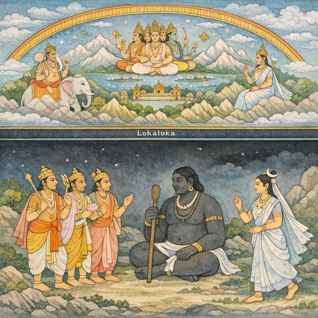 उसके परे एक पर्वत है जो सीमा का बाह्य मण्डल बनाता है। वही प्रकाश और अप्रकाश के लोकों का विभाजक है; उसे ‘लोकालोक’ कहा जाता है।