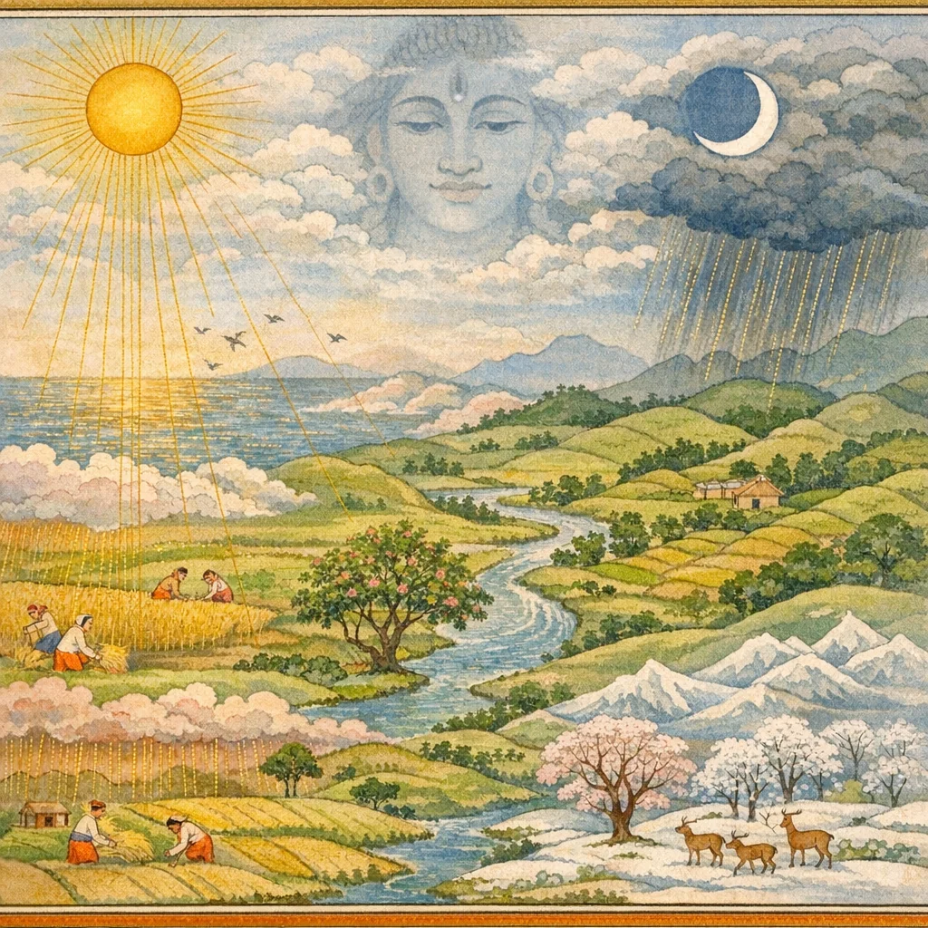 वसन्त में सूर्य कपिल (ताम्र-पीत) दीखता है; ग्रीष्म में काञ्चन-प्रभा से चमकता है; वर्षा में श्वेत वर्ण होता है; और शरद् में भास्कर पाण्डु होता है—इस प्रकार काल के गुणों में प्रभु की शक्ति प्रकट होती है।