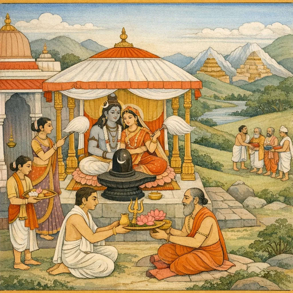 कुबेर-सदृश राजत-निर्मित आलय को शुद्ध चाँदी से बनाकर, उसमें उमासहित ईश्वर को प्रतिष्ठित किया गया, और चारों ओर गणेश-गणों ने उसे घेर लिया।