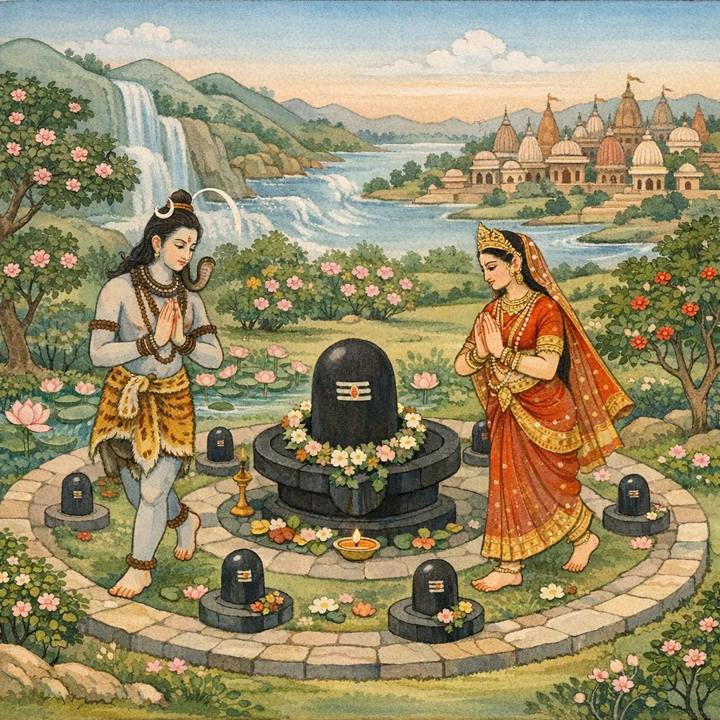 वहाँ का जल विस्तीर्ण और निर्मल था; हंसों के पंखों की वायु से कमल थरथराते थे। तटों पर केले के झुरमुटों के बीच मयूर चंचल होकर आनंद से नृत्य करते, मानो चौंककर भी ललित गति धारण कर लेते। कहीं-कहीं गिरे हुए मयूर-पंख चन्द्र-खण्ड जैसे लगते और धरती-प्रदेश को रंजित करते। देश-देश में मदमत्त हरित तोतों के झुंड उपवनों में विलीन होकर फिर प्रकट होते, हर्ष से चमकते—उस प्रदेश को शिव-सान्निध्य और लिंग-पूजन के लिए प्रत्यक्ष मङ्गल-क्षेत्र बनाते।