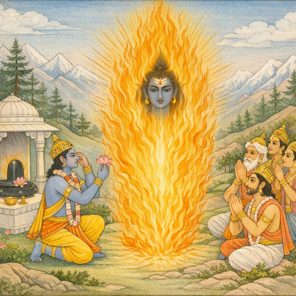 Shiva conceals one lotus from Vishnu’s complete offering, prompting Vishnu to substitute his own eye as the missing ‘lotus’ (padma). The episode signifies akhaṇḍa-bhakti (unbroken devotion), vow-integrity, and the principle that sincere worship transcends material scarcity.
