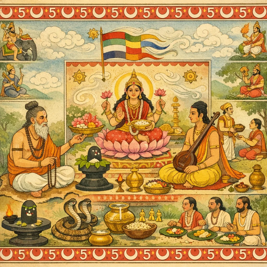 The Śrāvaṇa Kṛṣṇa Pañcamī discipline structures food as sacred economy: preparing and sprinkling foods, honoring Pitṛs/Ṛṣis, gifting to supplicants, then performing pradoṣa liṅga worship with pañcākṣarī japa and explicit prayers for seasonal grain supplies—linking ethical distribution, mantra, and agrarian well-being.