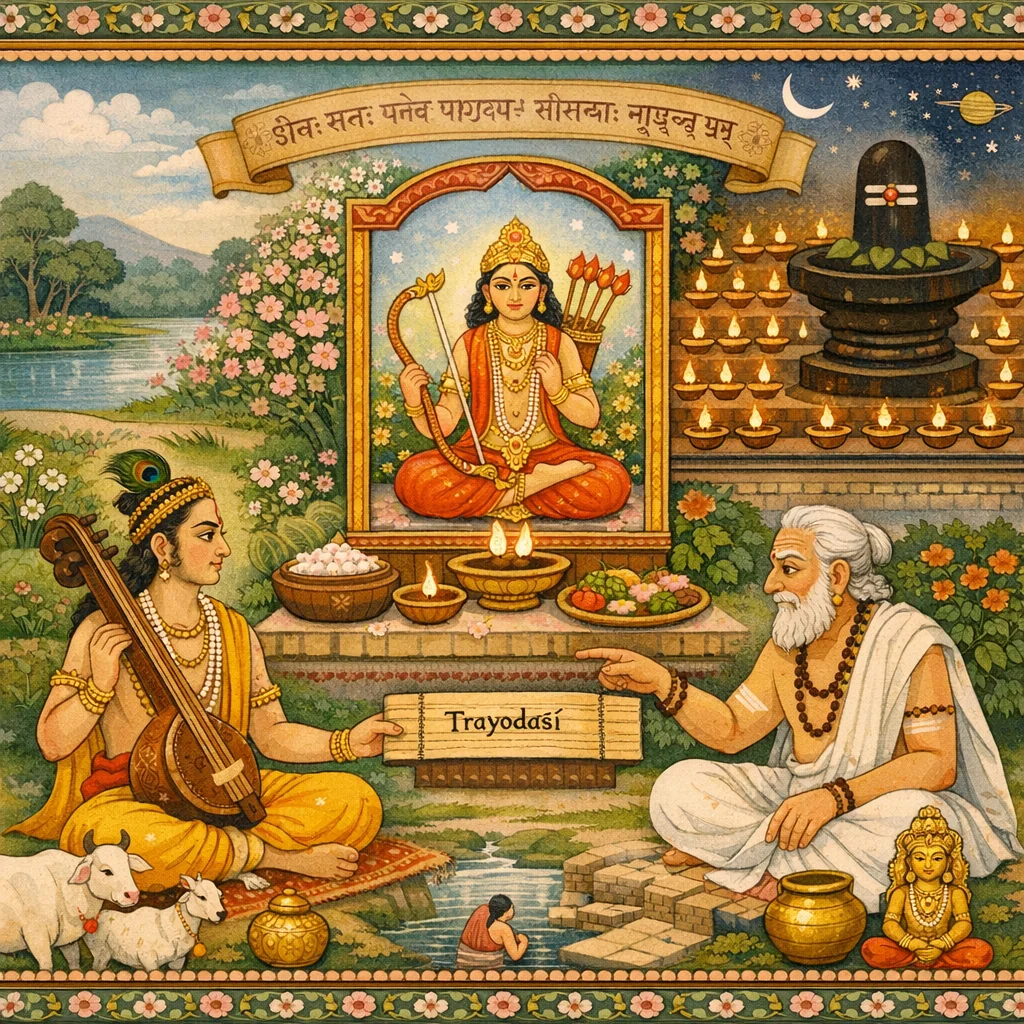 Trayodaśī is presented as a repeatable calendrical hinge for vrata-kalpa, where timing (tithi plus weekday/nakṣatra/yoga) amplifies merit; the text links it to prosperity (Kubera, dāna), lineage outcomes (progeny), marital stability (Rati–Kāma), and Śaiva grace (pradoṣa lamp-worship culminating in Śiva’s abode).