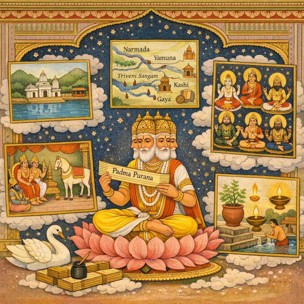 Brahmā bersabda: “Wahai putraku, dengarkan; akan kuuraikan Purāṇa yang dikenal sebagai Padma. Ia menganugerahkan pahala kebajikan besar bagi manusia—bagi yang mendengarnya dan yang melantunkannya dengan sukacita.”