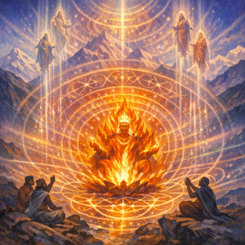 It presents Agni as the invited sacrificial guest who becomes present in the human assembly together with the gods, protects the rite by crushing obstacles, and brings prosperity through successful offerings.