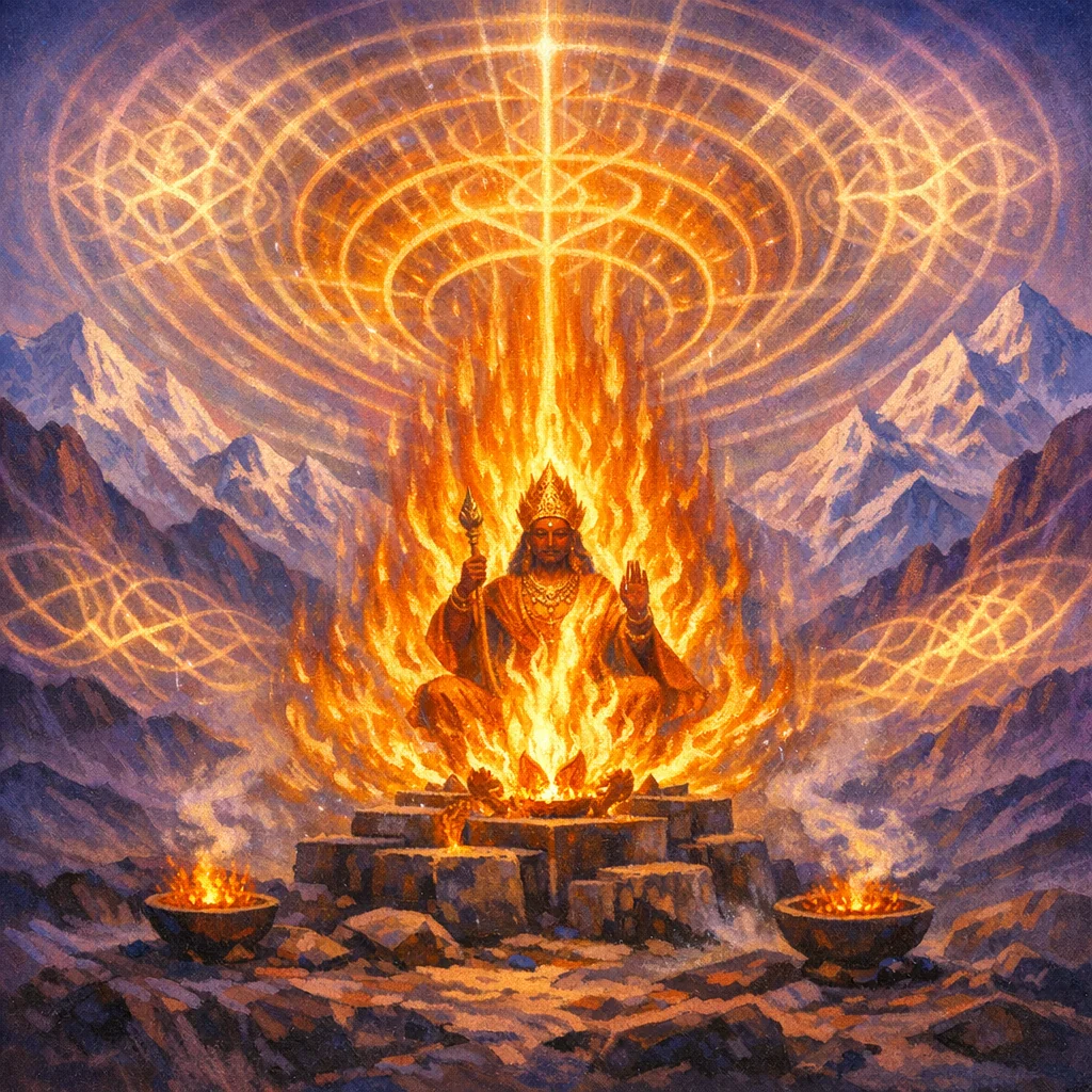 Agni yang dinyalakan dengan nyala cemerlang dipuji sebagai penjaga ṛta (tatanan benar kurban) serta kavi dan trātā—yang mengetahui dan melindungi tata upacara. Ia memurnikan persembahan dan para pemuja; ketika disulut dan dipuja dengan tepat, ia menjaga yajña, memberi sunīti (bimbingan baik), serta menganugerahkan rayi (kemakmuran) yang menambah daya, vayas (kekuatan hidup), dan nama harum yang mujur.