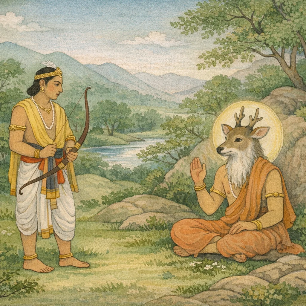 The deer said: “O best of men, what have you gained by killing me here though I am without offense? O king, I am an ascetic who lives on roots and fruits, wearing the guise of a deer. By striking down an innocent, you have committed a grave wrong; therefore, in return, I pronounce a curse upon you.”