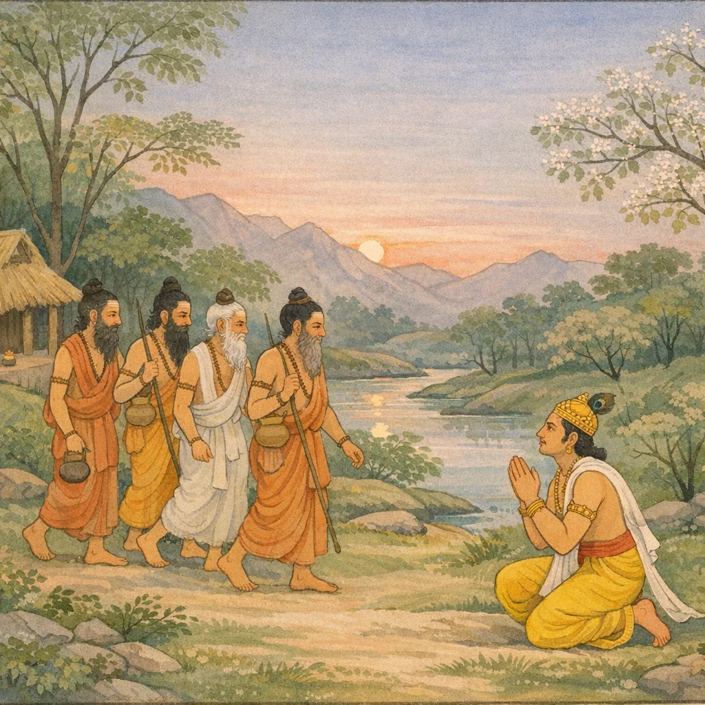 The sages said: “O righteous one, we perceive for you a blessed destiny—offspring radiant like the gods. By our divine insight we know this to be free from sin. Therefore, O king, strive to obtain the fruit that fortune has already allotted to you.”