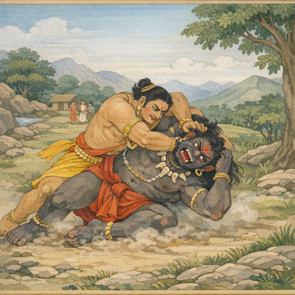 Vaiśampāyana said: Gripping the demon by the cloth at his waist with his left hand, the Pāṇḍava pressed down upon his back with his knee and seized his neck with his right hand. With overpowering force he bent the rākṣasa double, while the creature screamed in a terrifying roar—an image of brute violence being restrained by superior strength in the service of protection and righteous order.