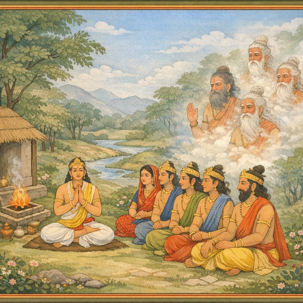 Chapter Arc: भीष्म-निधन के पश्चात शोक और कर्तव्य के संगम पर युधिष्ठिर ऋषियों के सत्कार में कृतज्ञता प्रकट करते हैं—और तभी महर्षियों का अद्भुत अन्तर्धान सबको विस्मित कर देता है। → राजा के मन में युद्धोत्तर अपराध-बोध, कुल-क्षय का शोक और राज्य-धर्म का भार एक साथ उठता है; शौचकर्म, और्ध्वदैहिक क्रियाएँ और ब्राह्मण-पूजन के बीच यह प्रश्न गूंजता है कि अब धर्मराज्य कैसे स्थापित हो। → सबके देखते-देखते महर्षियों का वहीं अदर्शन हो जाना और उसके बाद युधिष्ठिर द्वारा भीष्म, कर्ण आदि कुरुवंशियों के निमित्त श्राद्ध/और्ध्वदैहिक कर्म का विधिवत संपादन—यही अध्याय का शिखर है, जहाँ शोक कर्म में रूपांतरित होता है। → युधिष्ठिर ब्राह्मणों को बहुधन दान देते हैं, देवताओं-ब्राह्मणों का पूजन करते हैं, धृतराष्ट्र को अग्र में रखकर हस्तिनापुर (गजसाह्वय) में प्रवेश करते हैं और समुद्र-पर्यन्त पृथ्वी का धर्मपूर्वक शासन आरम्भ करते हैं। → हस्तिनापुर में धर्मराज्य की स्थापना के साथ आगे के राजधर्म, प्रायश्चित्त और अश्वमेध-योजना की भूमिका बनती है।