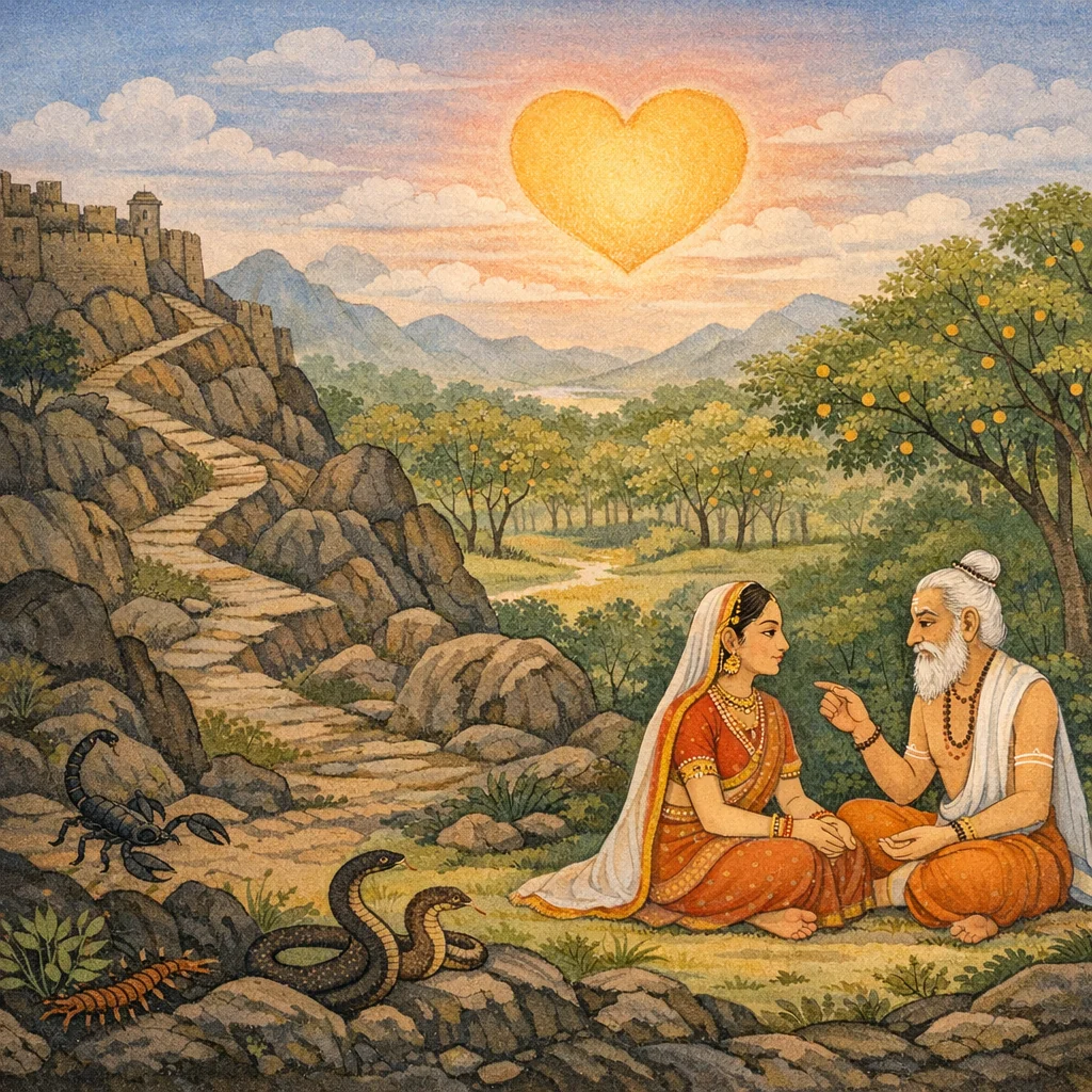 The Brahmin said: “Beloved, there is a realm where swarms of mosquitoes and gadflies take the form of restless intentions; where the alternating pains of grief and delight are like cold and heat; where the darkness of delusion spreads like night; and where greed and disease move about like serpents. Having crossed that hard-to-traverse path of worldly life—where one must go alone and where desire and anger lie encamped as enemies—I have now entered the great forest of Brahman, the inner domain of spiritual reality.”